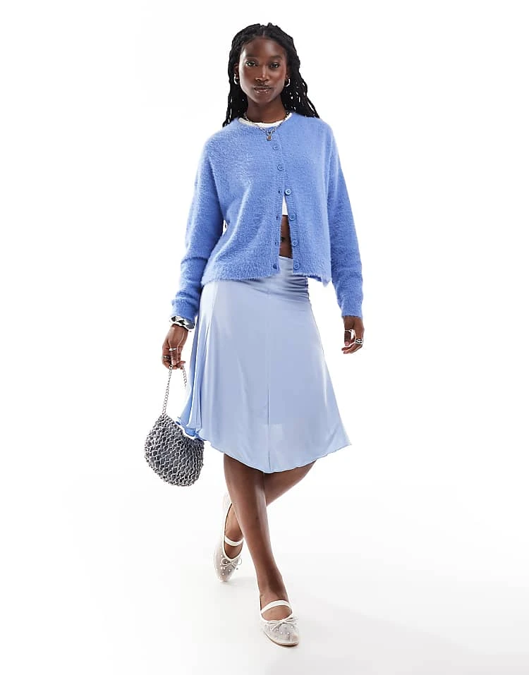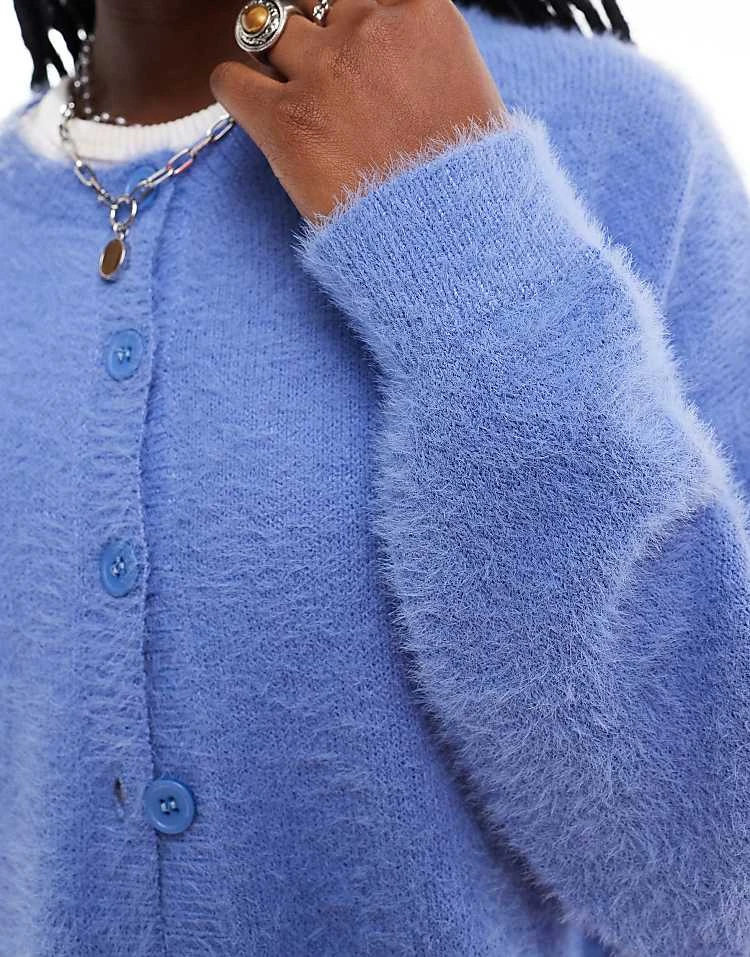 Daisy Street Blue Fluffyeyelash Knit Boxy Crew Neck Cardigan For Women