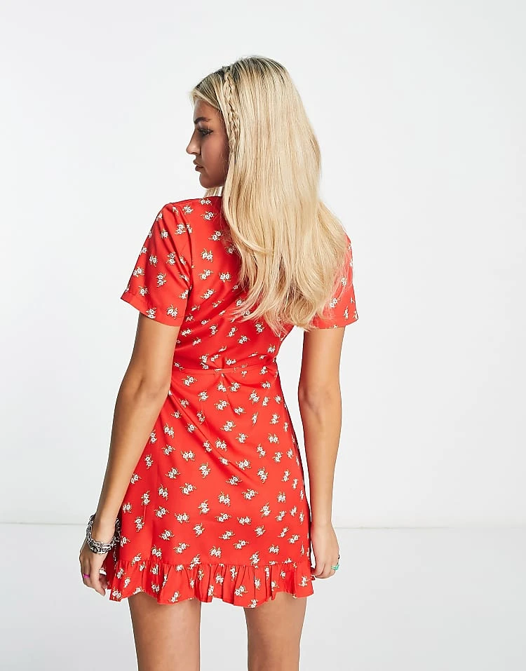 Daisy Street Wrap Front Short Sleeve Mini Dress In Red Ditsy For Women